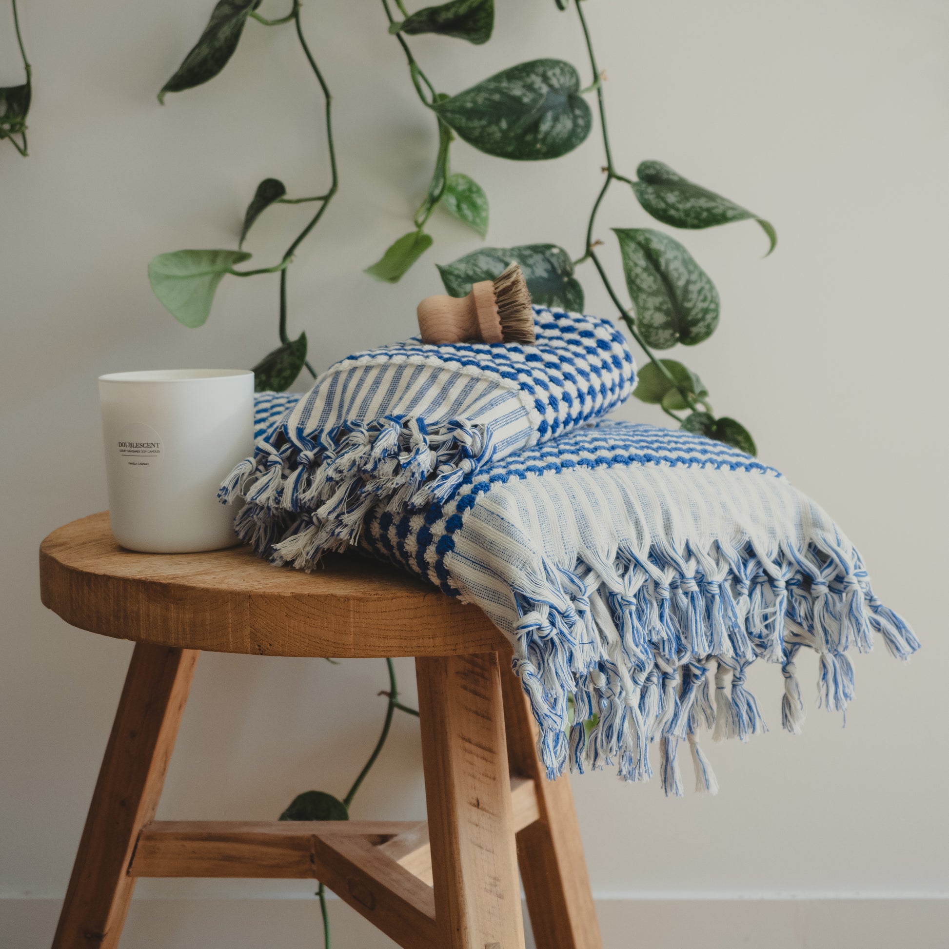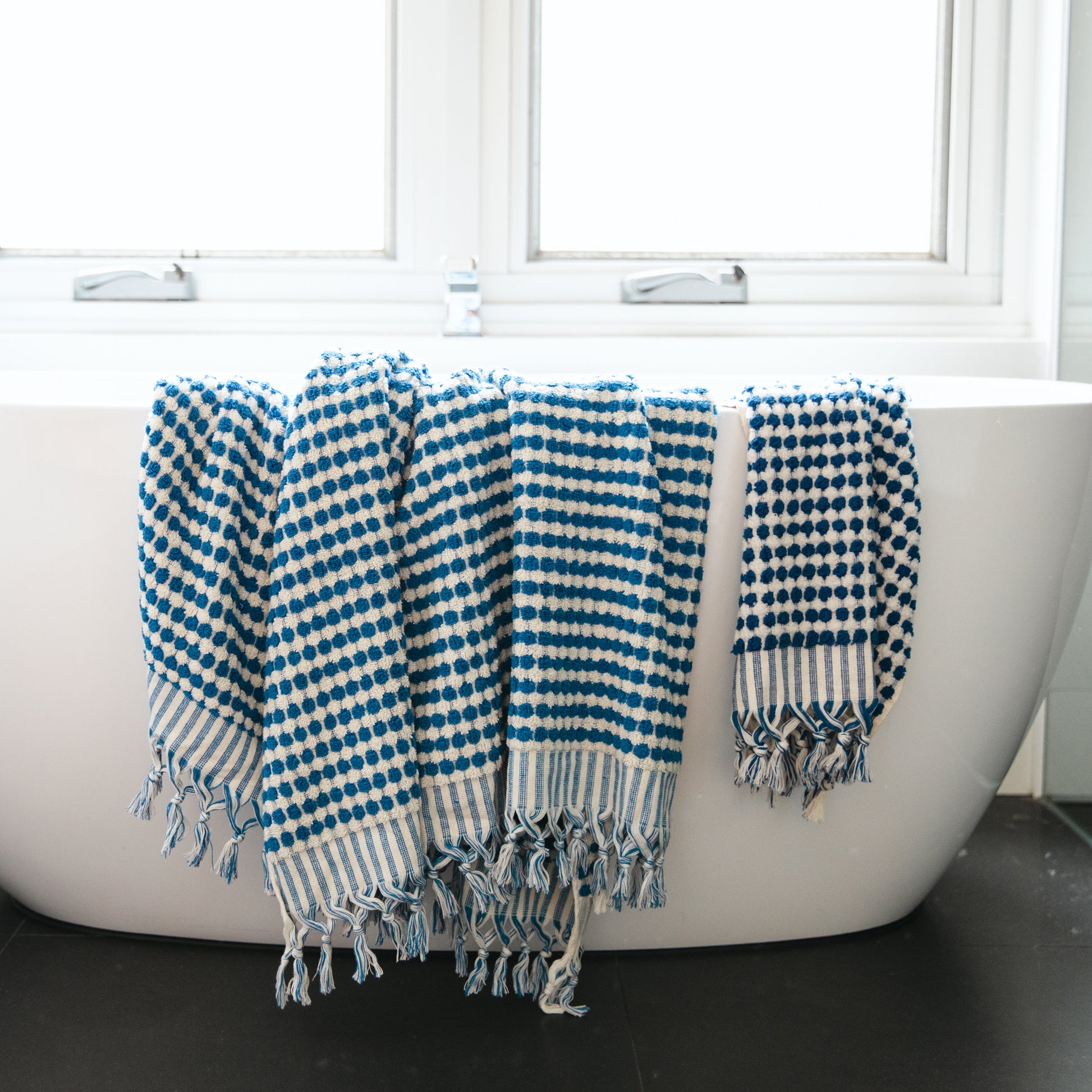 INDIGO AND WHITE DOTS Turkish Cotton Hand Towel is a modern touch to traditional Turkish Hammam Towels.