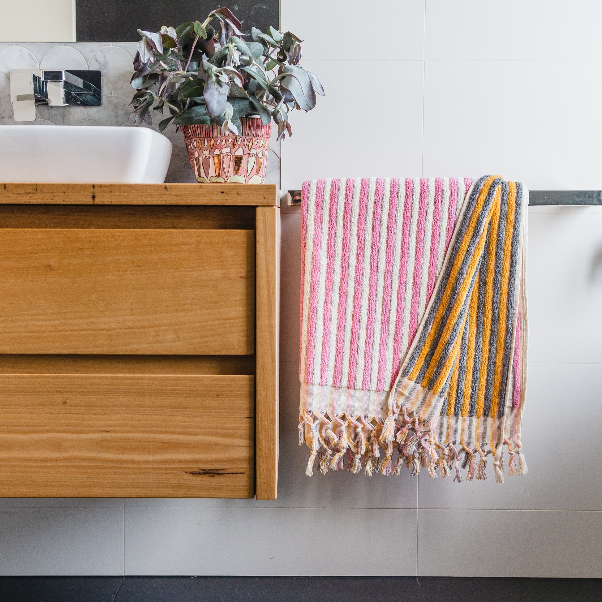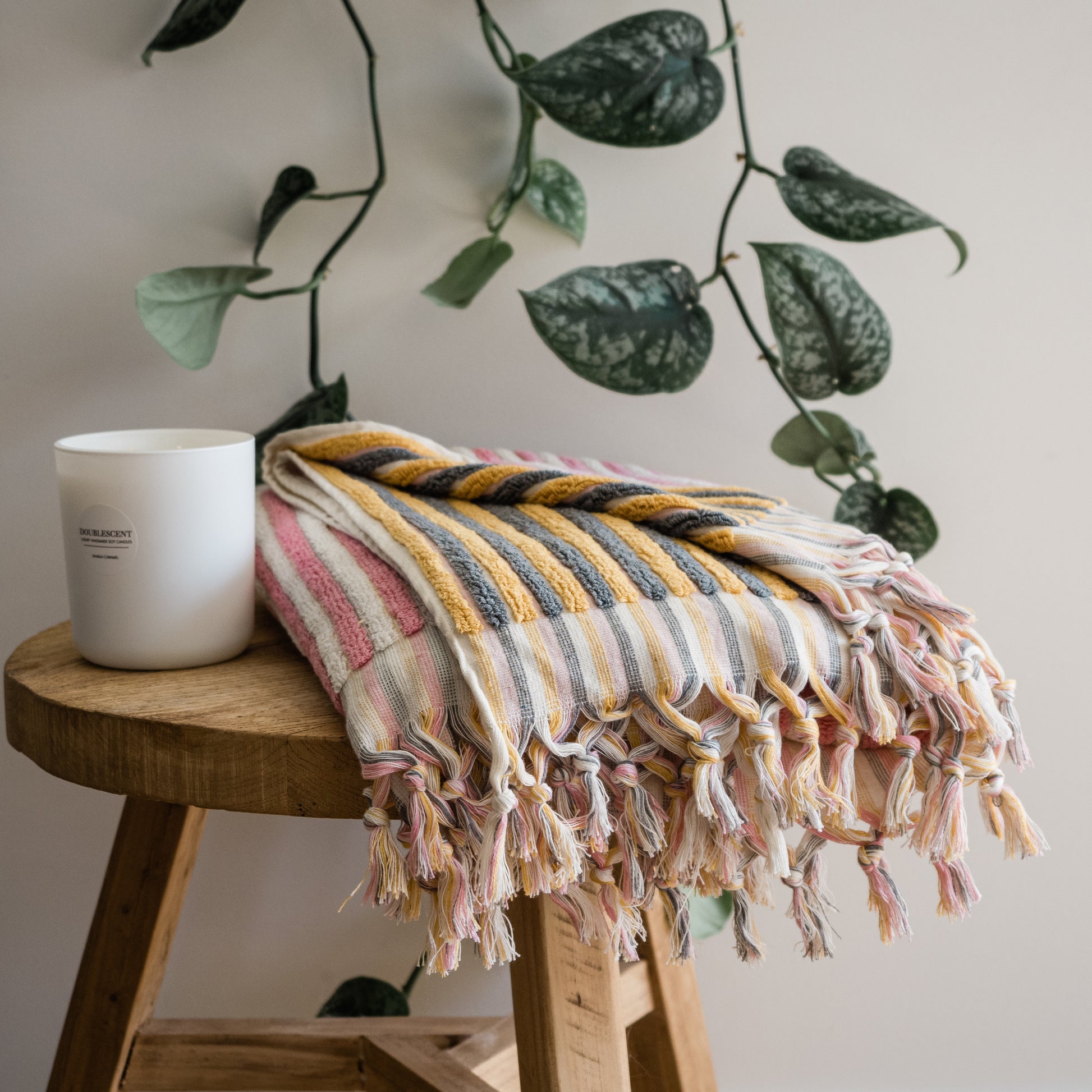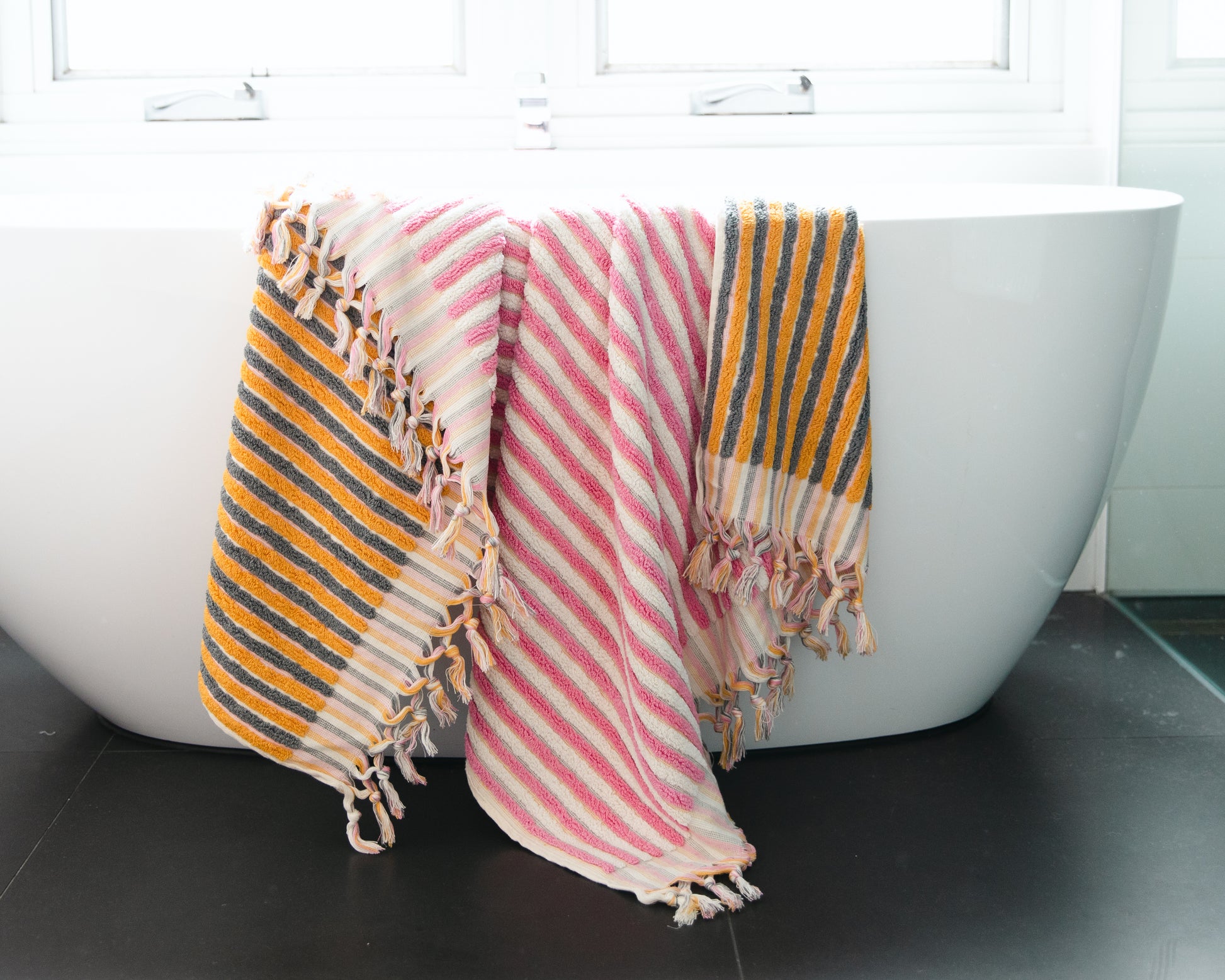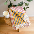 COTTON CANDY Stripe Turkish Bath Sheet Towels are so fluffy and cosy because of their looming technique. They feature terry weaving on both sides and tear-resistant strength. After they are woven the tassels are tightened by a unique hand rolling method. It is the natural woven textile feature that makes these towels extremely durable.